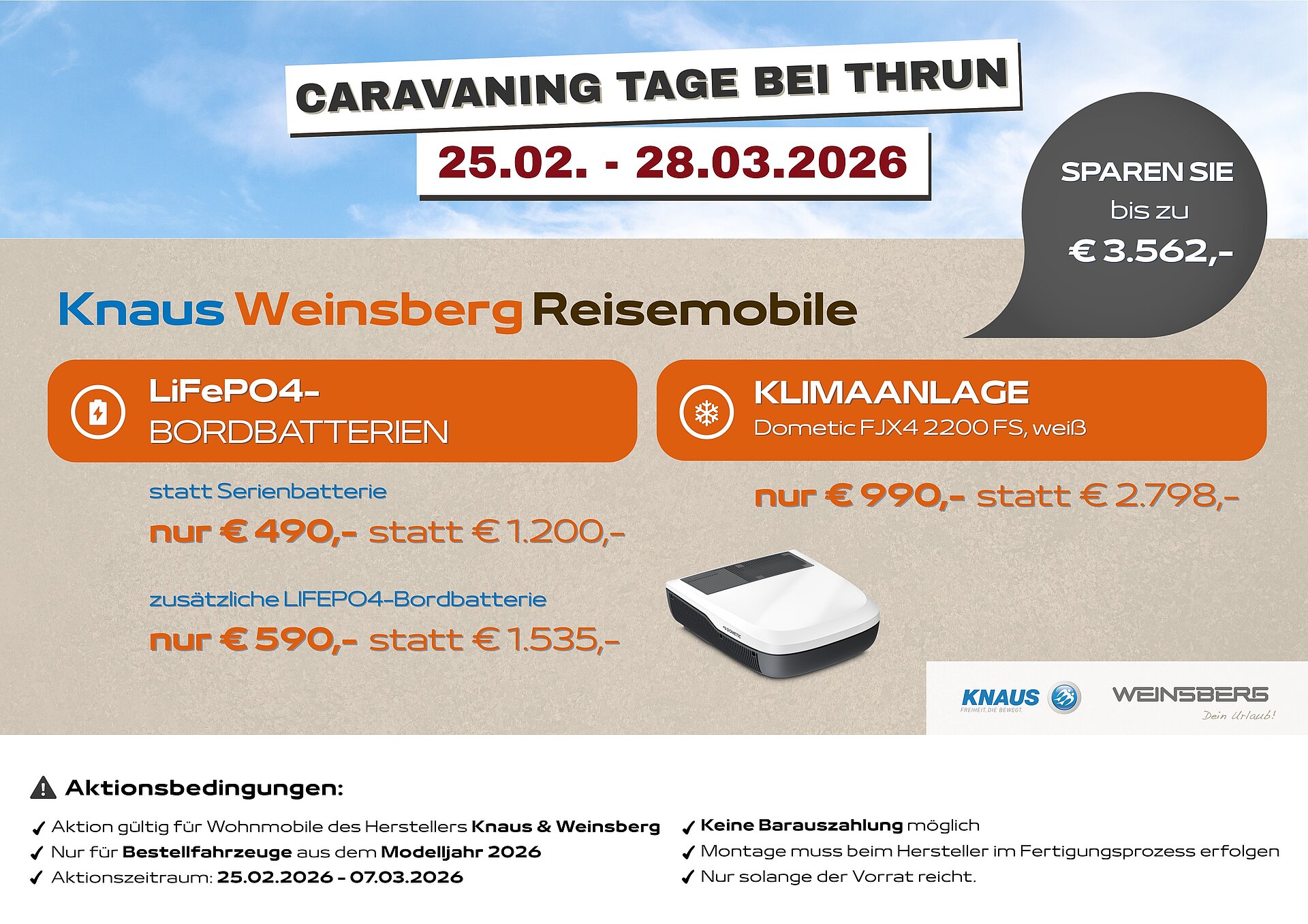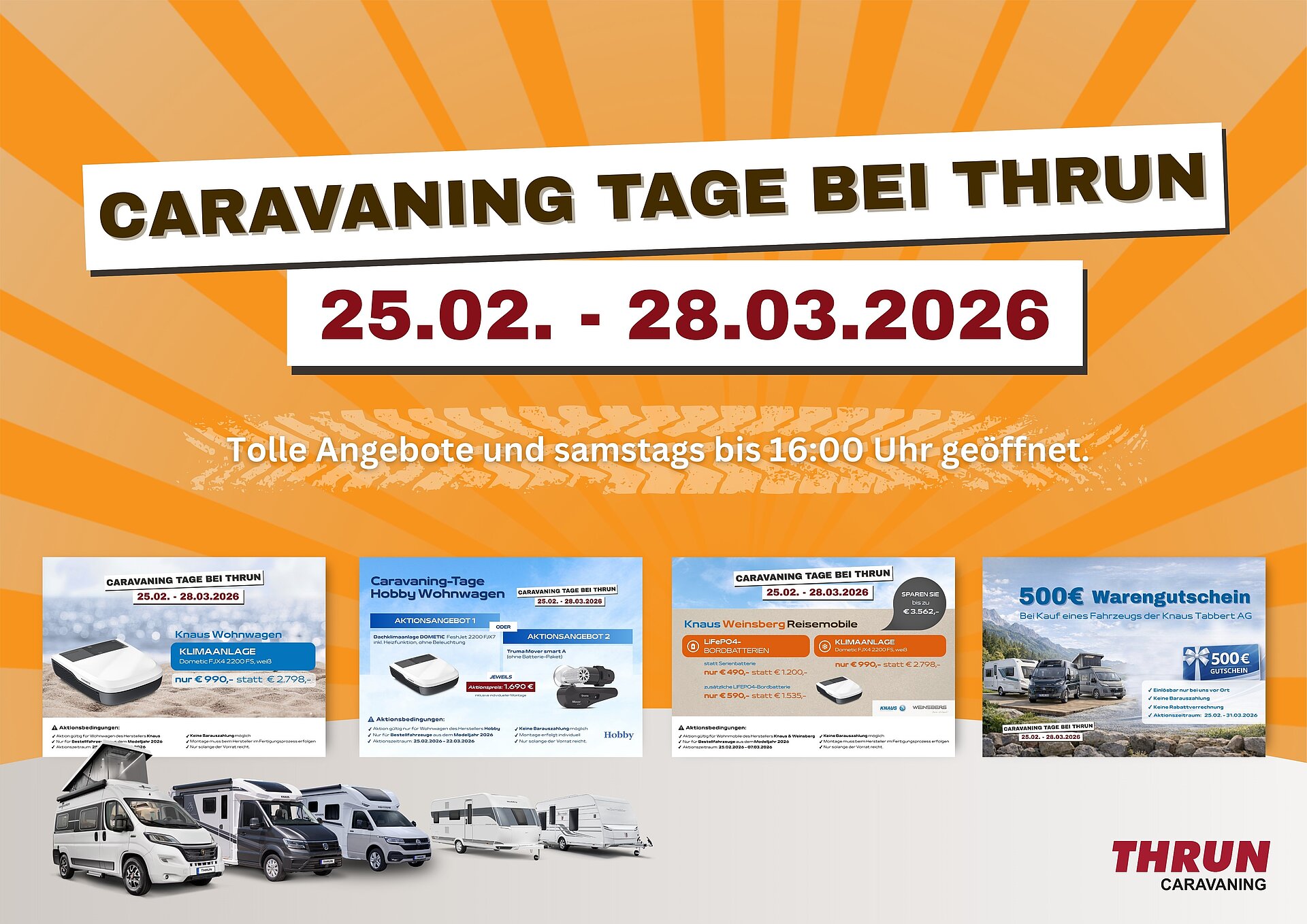vom 25. Februar - 28. März 2026 haben wir bei verlängerten Samstags Öffnungszeiten, Messe Ersatzaktionen. Profitieren Sie in dieser Zeit von unseren extra Angeboten. Bitte beachten Sie, dass die Angebote teilweise markenabhängig sind und nicht kombiniert werden können. Wir beraten Sie gern.